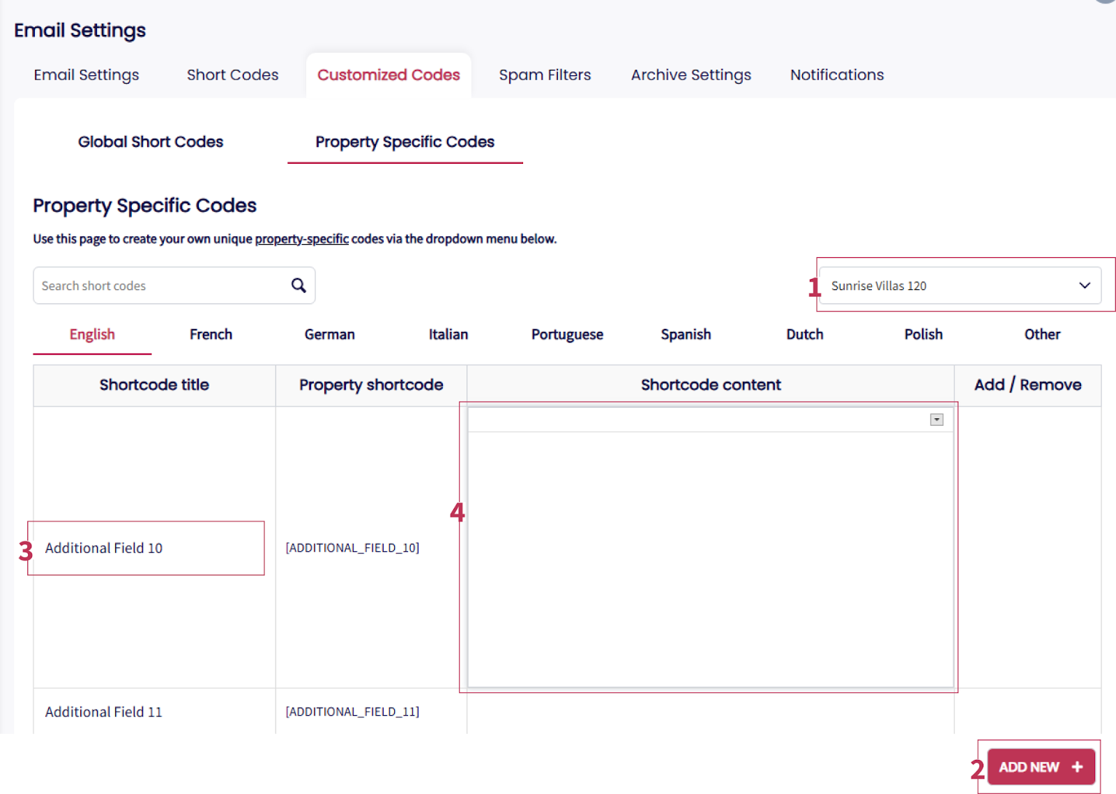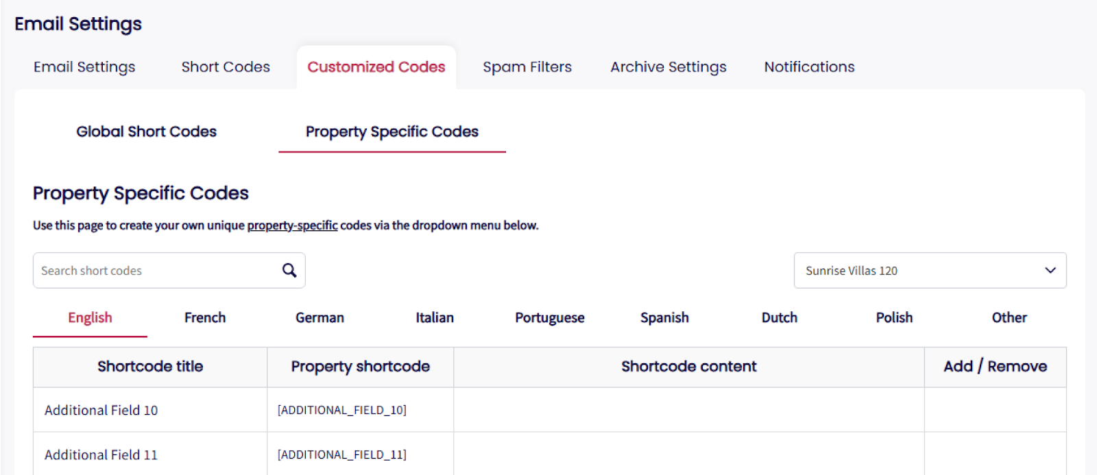 Create personalized short codes for standardized content across properties, supporting languages like French, Dutch, Italian, and more. To create customized global short codes, go to Settings > Email Settings > Customized Codes.