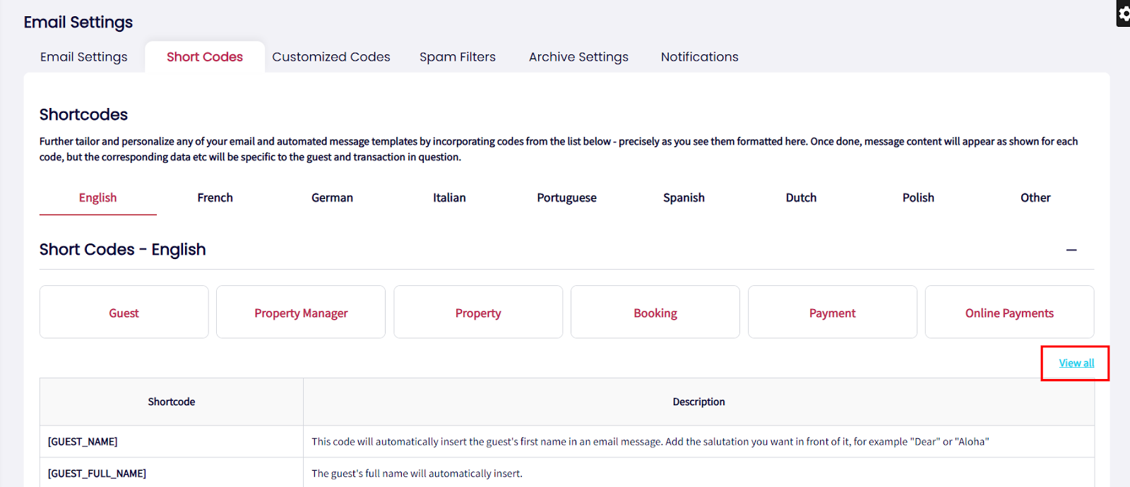 We provide multiple categories with pre-made short codes, including Guest Info, Property Manager, Property, Booking, Payment and Online Payments, for easy personalization of emails and automated messages. Each code dynamically inserts guest and booking-specific data, ensuring customized content every time.