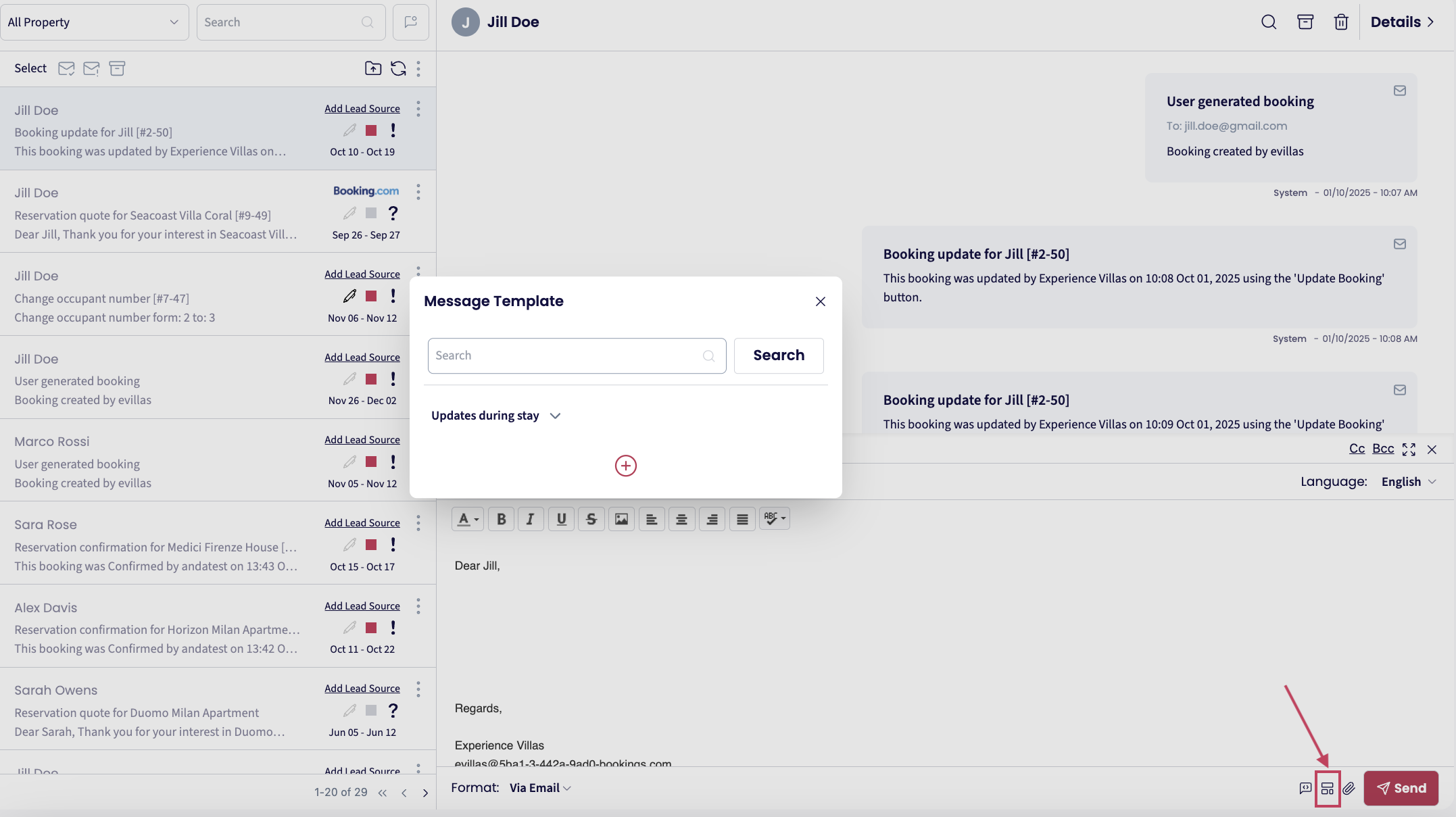 Click the Message Template icon from the Message Composer while replying to a guest, then choose a suitable Custom Template from the list.