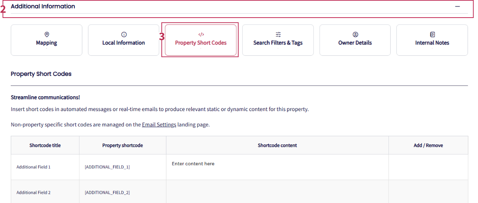 Note: The short code [ADDITIONAL_FIELD_X] is fixed across properties, but the content is property-specific. For example: If [ADDITIONAL_FIELD_1] is for a Wi-Fi password, enter each property’s password in its own [ADDITIONAL_FIELD_1] content.