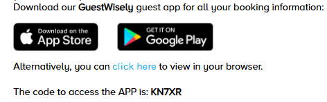 Advise your guests to download GuestWisely Guest App from the App Store or Google Play and they can log in using the personal code you provide. Details covered shortly.