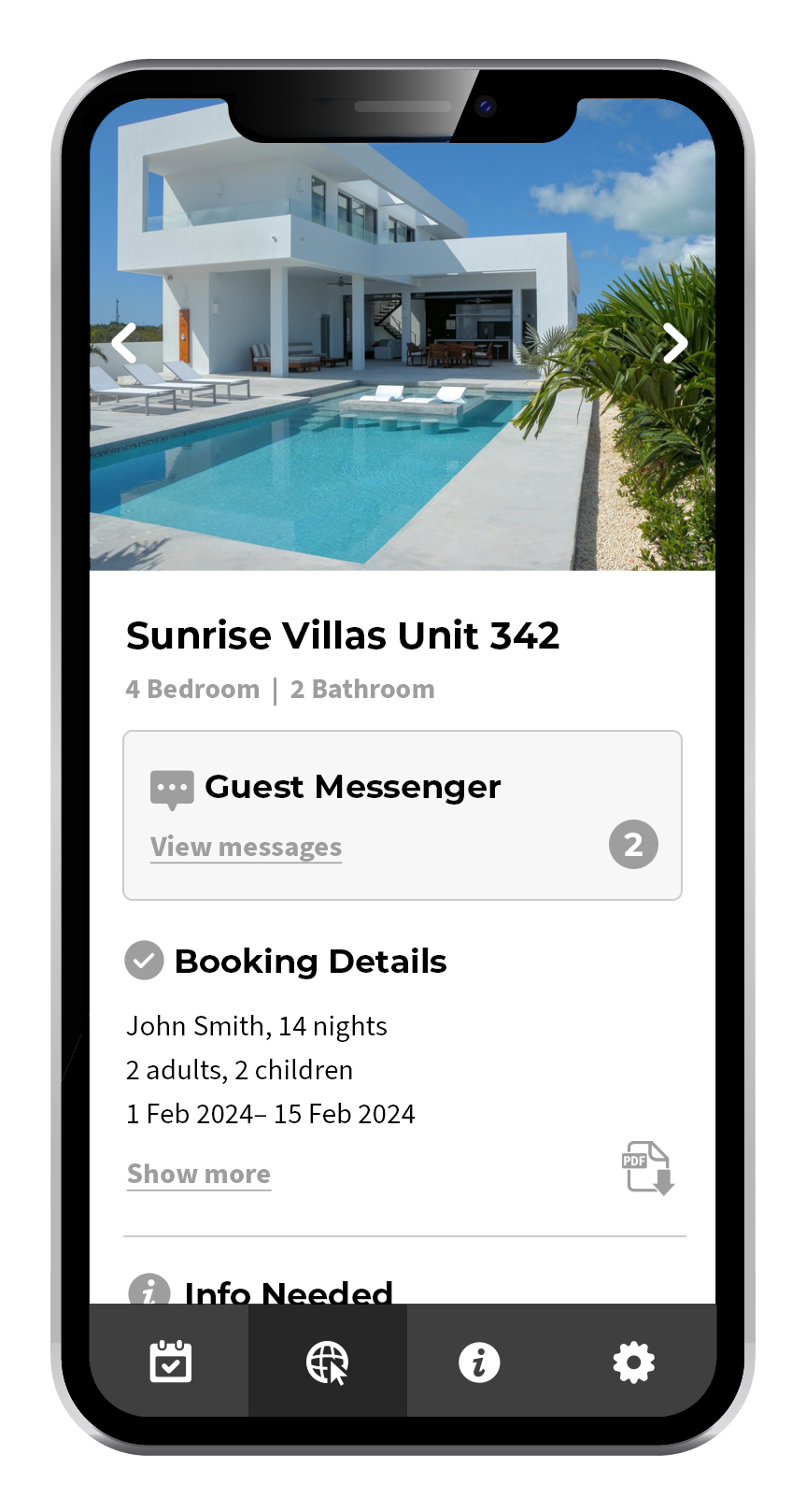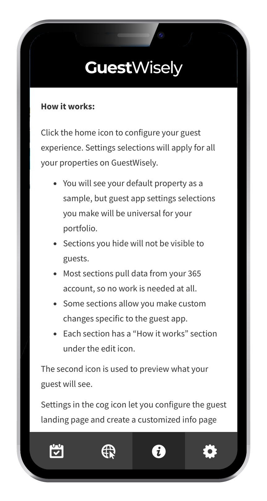 The 365Guest app is your dedicated management hub, required to set up and administer GuestWisely for your guests. Tailored specifically for our property manager users, it enables you to customize GuestWisely settings, decide exactly what information and tools to share, and preview your guest experience. All booking, property and policy information is automatically synchronized from the GuestWisely PMS platform, ensuring everything stays accurate and up to date.