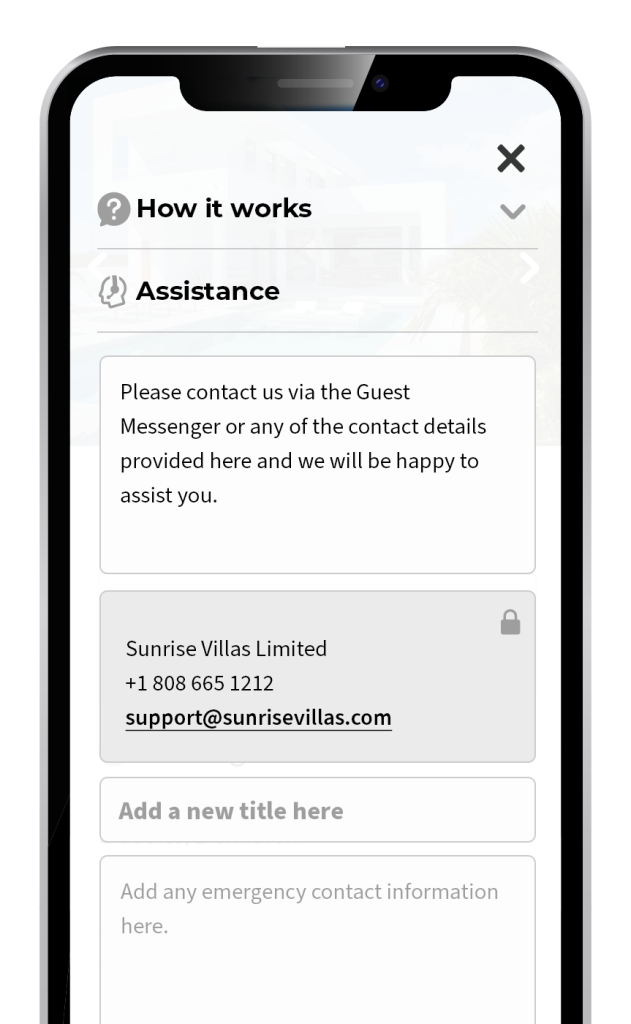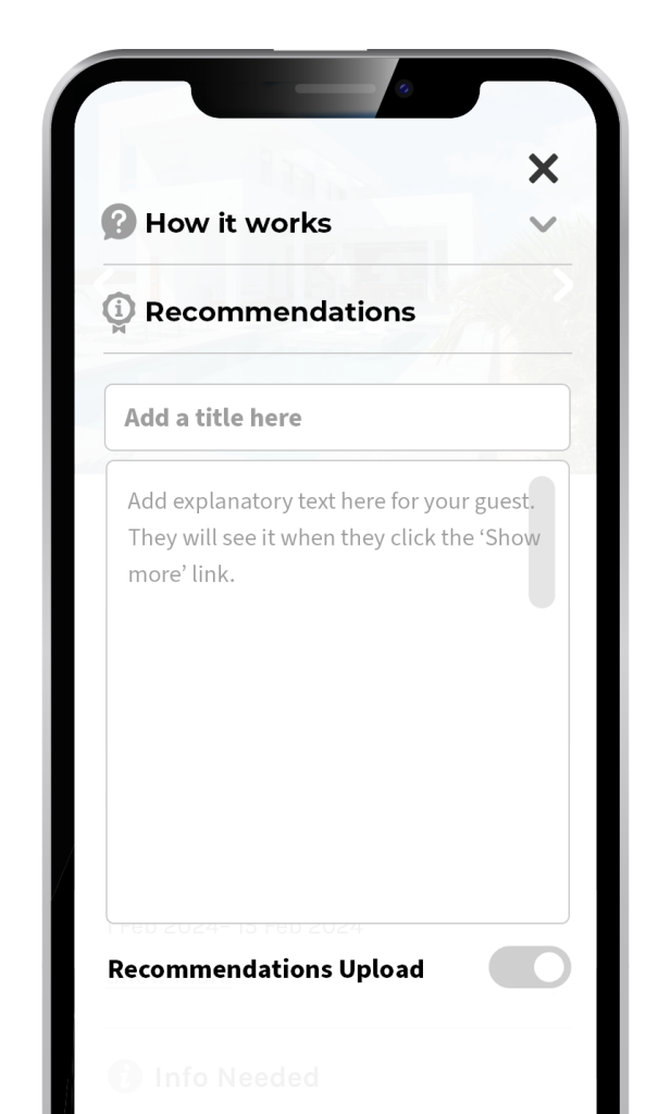 Recommendations![]() | Share top attractions, dining spots and activities. | Adds value to the stay, enhances guest satisfaction with local tips. |