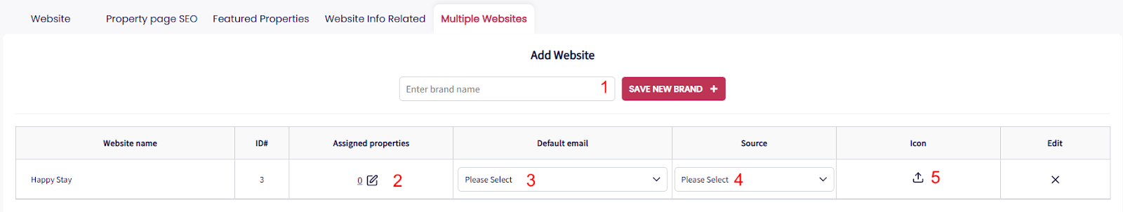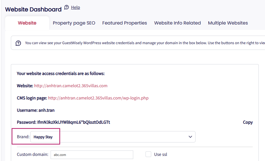 If you have a GuestWisely-integrated website for selected properties, after adding a brand in Step 2, simply navigate to the Website tab and select the brand. No additional steps are required. The system will automatically recognize the brand when a guest makes a booking.