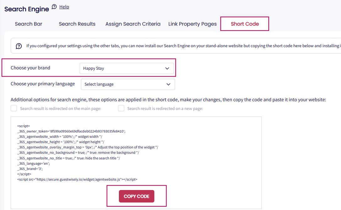 For each property, copy the code for the individual booking engine and insert it into the respective property detail page on the standalone website (your developer can assist with this part). This allows guests to make bookings directly.
