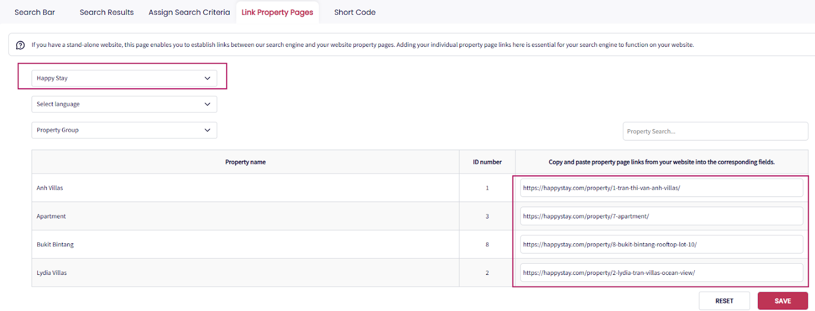 This ensures the search function redirects guests to the correct property detail pages.