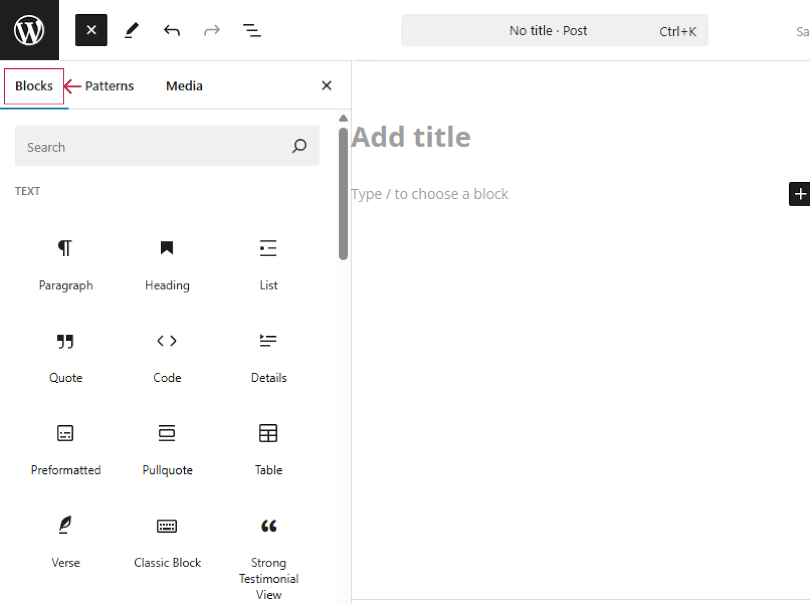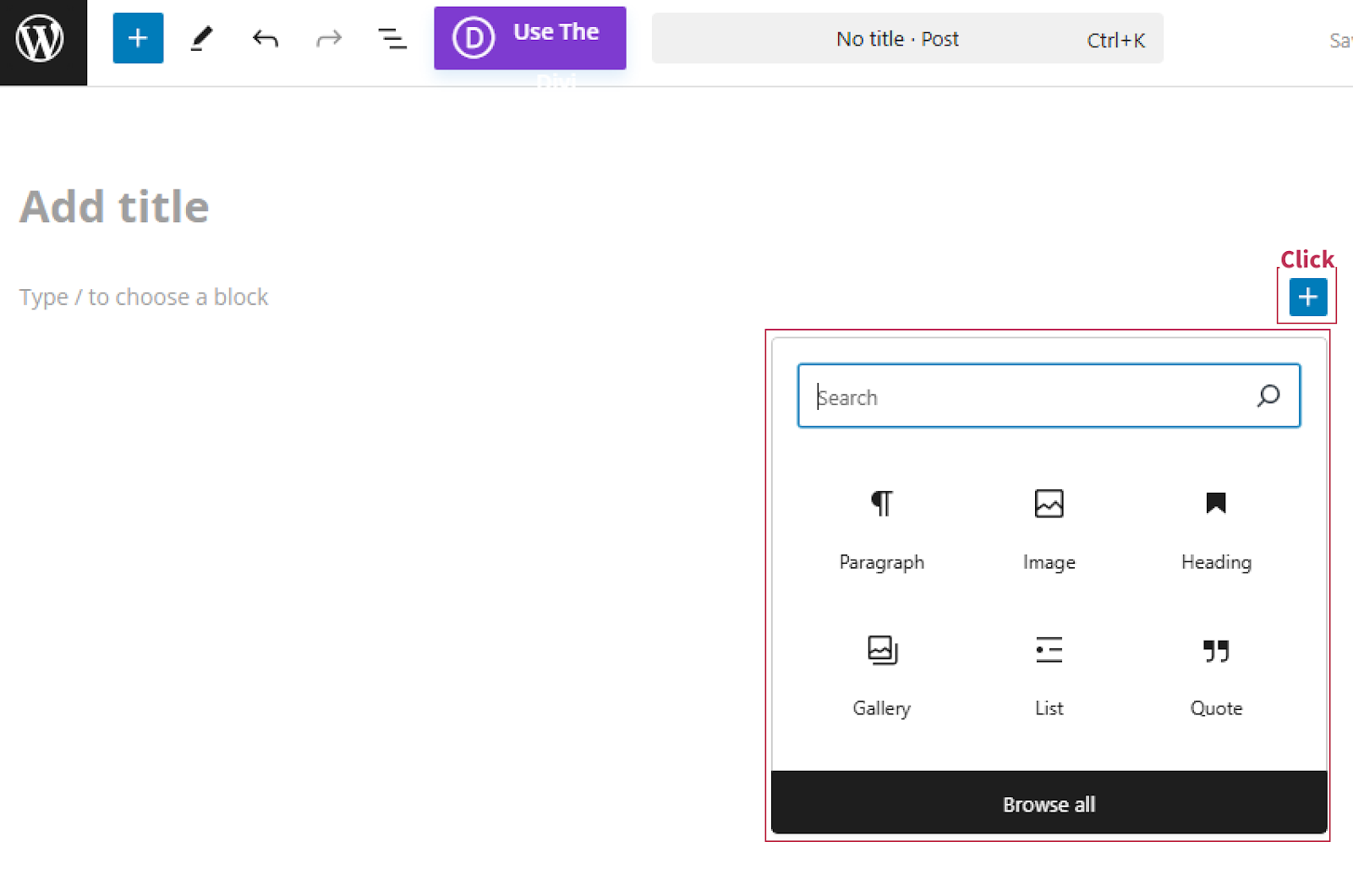 When you press enter after your first paragraph, the next ‘block’ options will appear, displaying a blue plus icon. Click this for more block options available for adding to your post content. This presents you with an initial handful of extras but you can ‘Browse all’ to bring up a full menu attached to the left of the screen. This includes many options, the most popular would be Headings (H1 displaying the largest), Images, Galleries and even Videos.