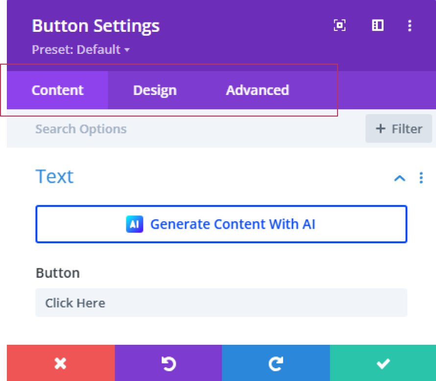 Settings will be mostly heavily used, which is split into 3 tabs of Content, Design and Advanced. You may visit the Design tab for initial setup of styling but Content will be the go-to place for add/editing your website text and images.