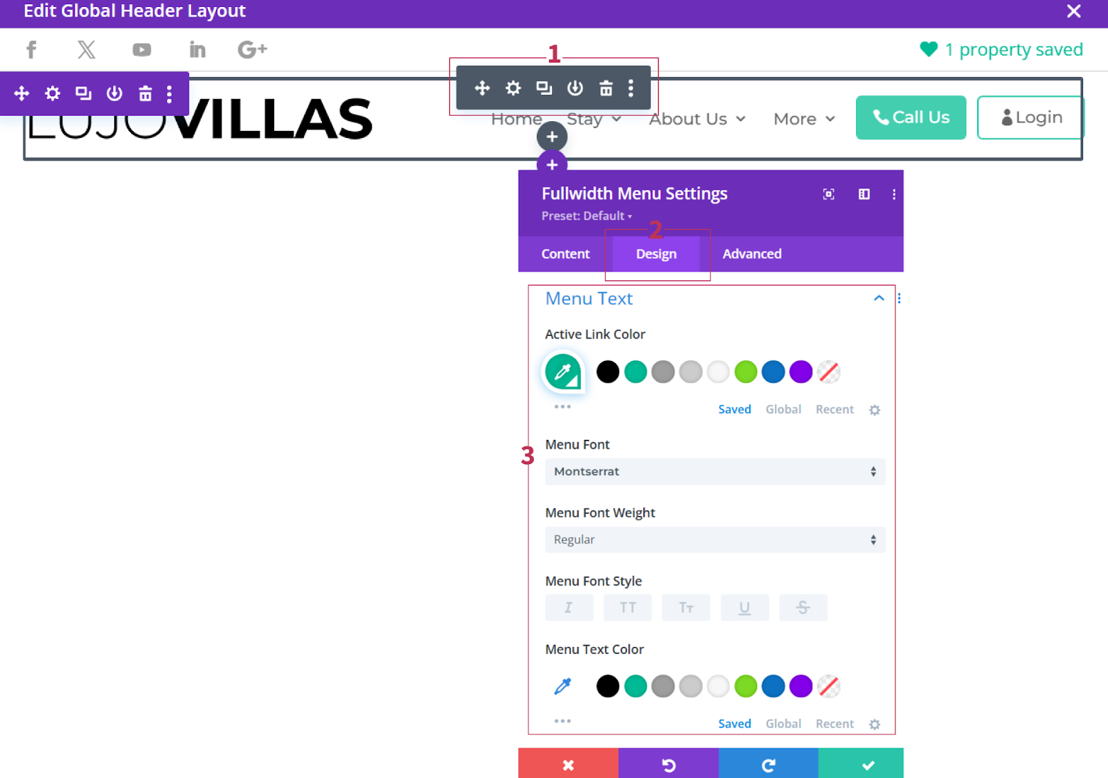 Your theme header consists of the Primary Menu (module). It is connected to your Site Logo in Divi settings and the font pulls automatically from the WP Customizer body font – so nearly everything is pre-prepared.