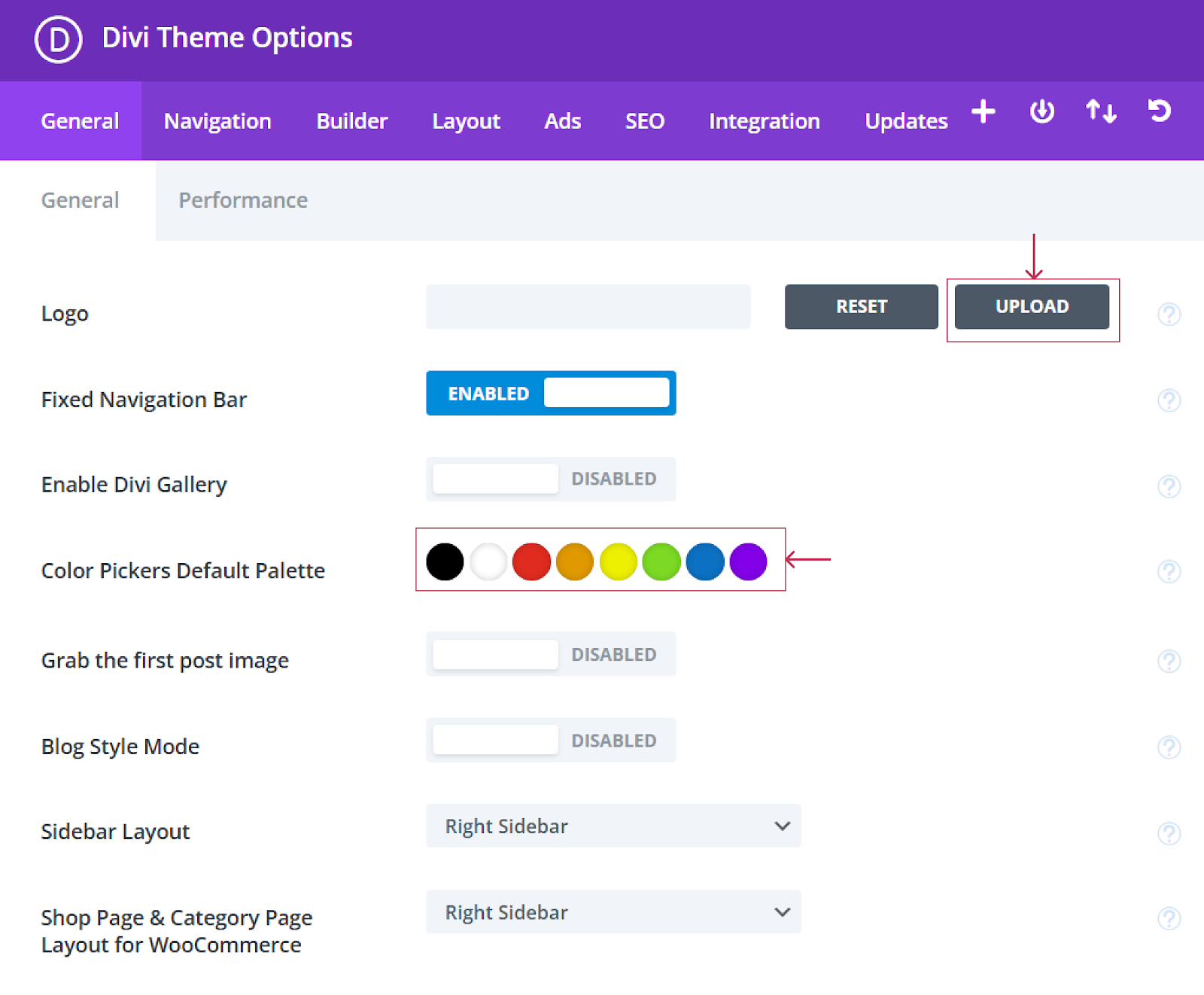 Color Palette: A little further down from Logo you will see a default colour palette. These will pull through to the Divi Page Builder for every setting you have for editing – making it a much quicker process for updating your template theme. These will also link with your global colour which we will set later, that updates the whole website.