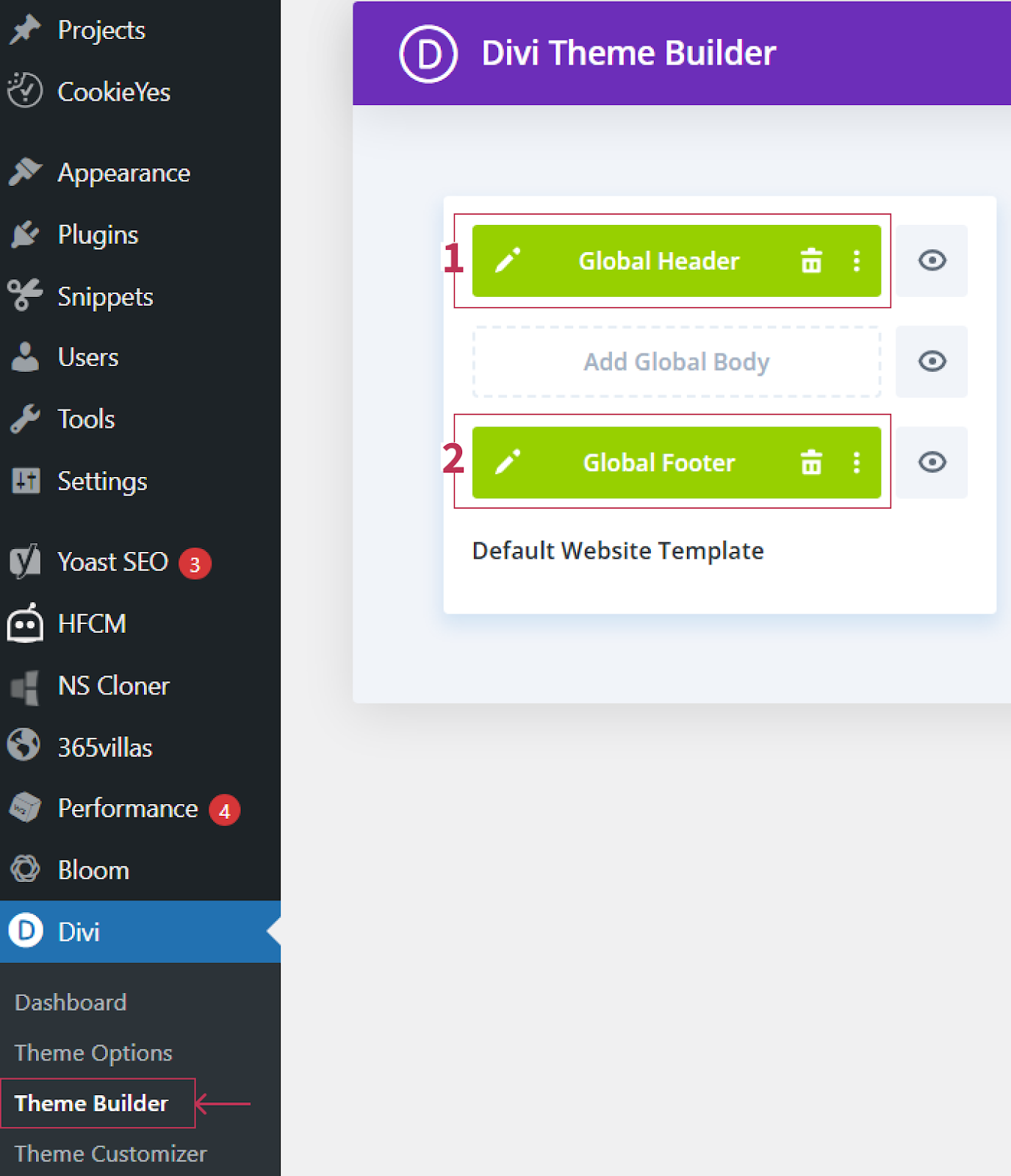 The first container stores the templates that are used as default on every webpage – we call this our global templates. Click the edit icon on either the green global header or footer bars to open the Divi Visual Builder.