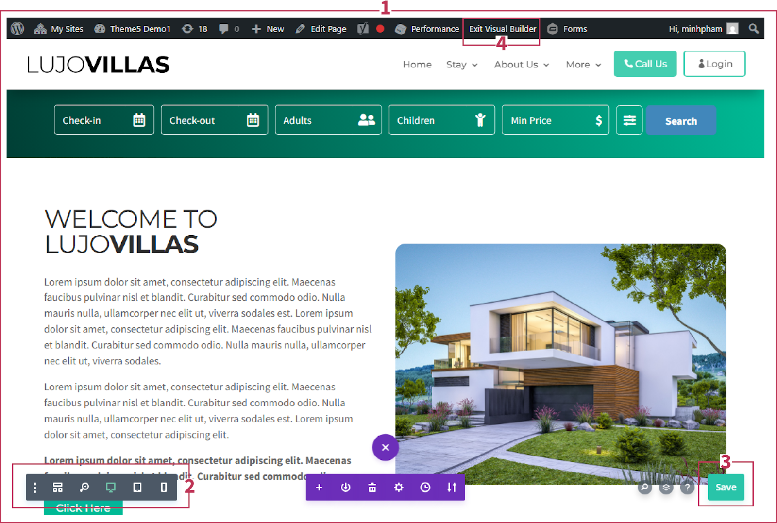 Exit Visual Builder: This can be done from the WordPress topbar. If you wish to leave and visit the current live page, click Exit Visual Builder. Or to go back to your WordPress CMS click Dashboard from the top-left dropdown.