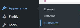 We are going to make a start with the top-level WordPress website styles. Go to Appearance Menu > Customize. This will open the settings screen below, the following tabs need to be visited.