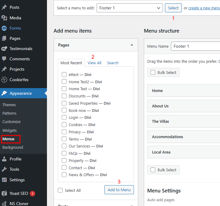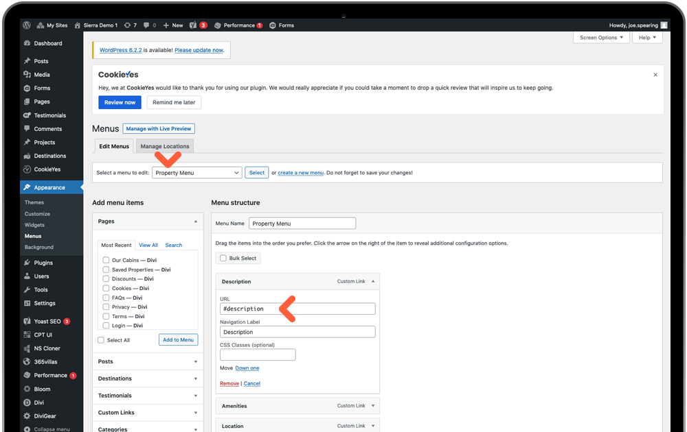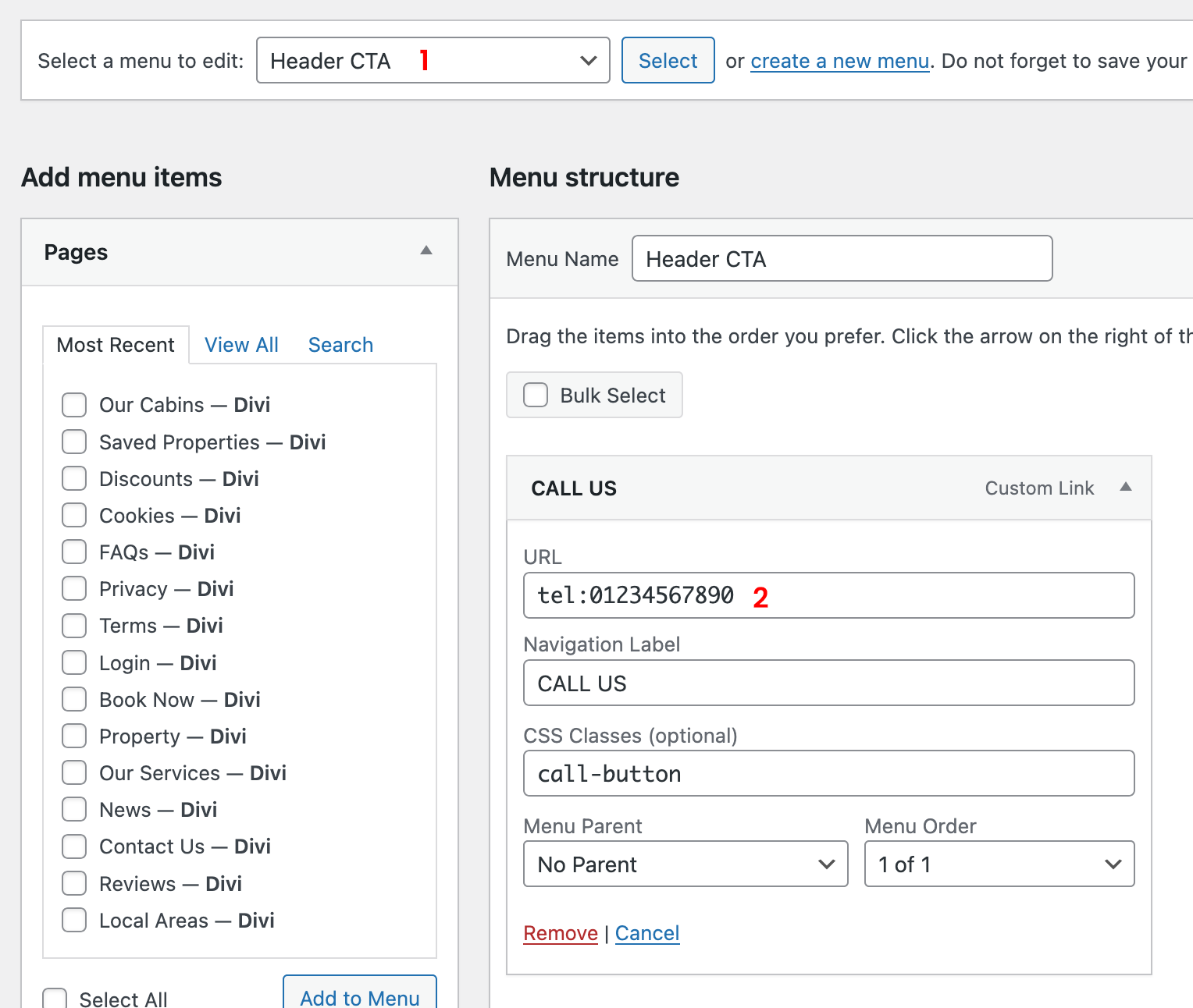There are 4 locations for menus in Sierra. The Primary Main Header, Header CTA (Telephone Call to Action), Footer Column Menus and Property Page Menu.