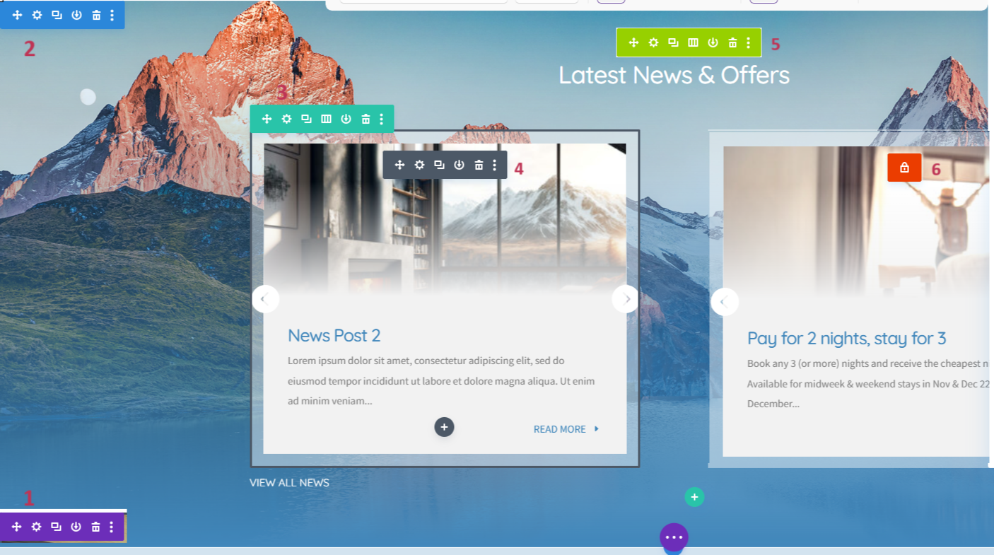 Wireframe View: This is an alternative view of the page to the live view of the visual builder. It shows a section view of what we have covered above, color-coded and labelled for clarity. We recommend using this in some intricate edits, covered later in the tutorials.