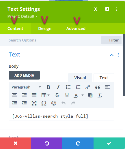 Settings will be mostly heavily used, which is split into 3 tabs of Content, Design and Advanced. You may visit the Design tab for initial setup of styling but Content will be the go-to place for add/editing your website text and images.