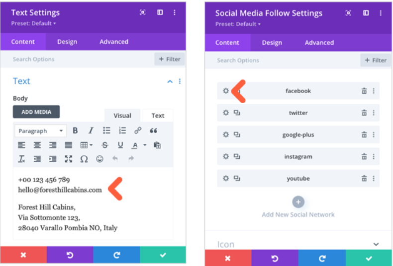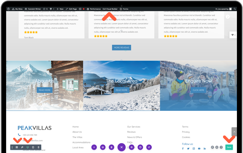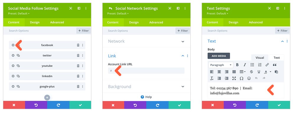 Enter the footer via the Edit icon where you will make a few small edits to your company information. The footer logo is also connected to the Site logo settings so no changes needed. Make your way through each grey module editing Tel, Email, Address and Social Media as shown below. The Menu items are controlled in WordPress CMS later, should you need to update.