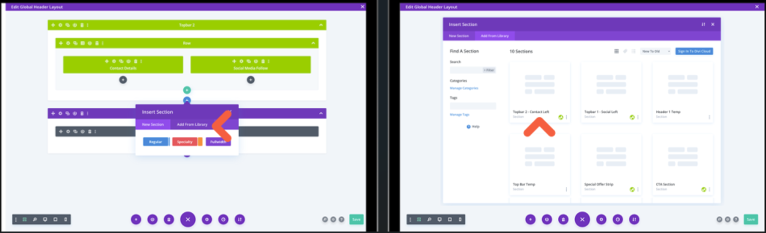 Toolbar 2 - There is an alternative Topbar you may use if you are not active on social media. Simply click the blue (section) plus icon, ‘Add from Library’ tab and select Topbar 2 – ‘Use this layout’ button. This uses a Text module for you to display Tel, Email and/or address. Delete the existing Topbar 1 with the trash icon in the the toolbar menu.