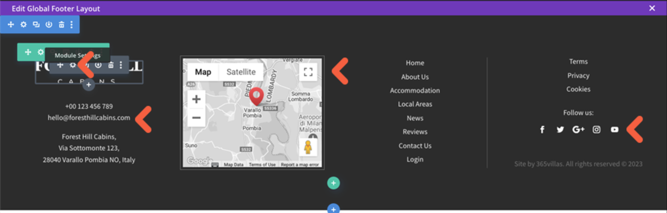 Enter the global footer via the Edit icon where you will make a few small edits to your company information, map and social media links. The footer logo is also connected to the Site logo settings but if you have changed the footer background color and need a new version of the logo to stand out, you can change this via the module settings. Make your way through each grey module editing Logo, Tel, Email, Address and Social Media using the module instructions in Creating Page Content. The Menu structure is also controlled in WordPress CMS (covered later in the tutorial), should you need to.