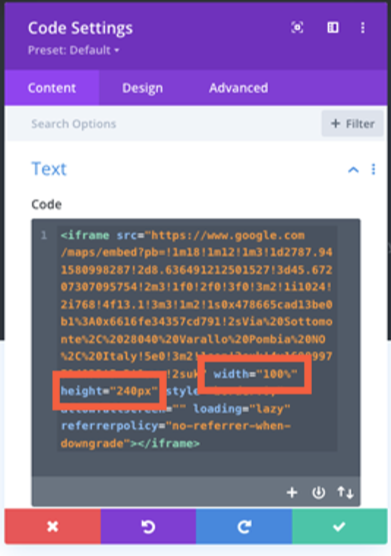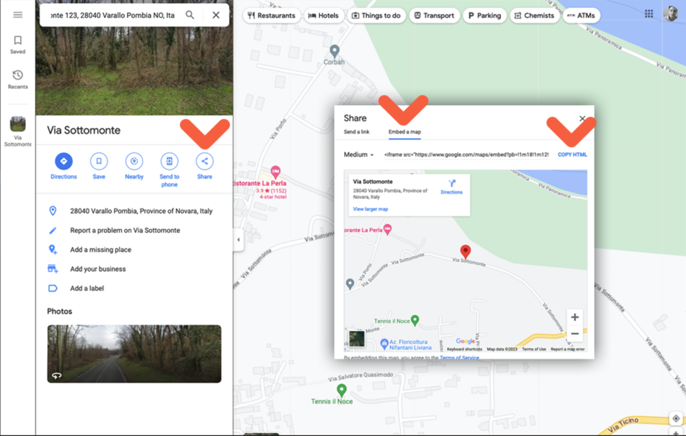 For the footer map you will need to insert an embedded map from google maps rather than using the Divi map module. This is because the footer appears on every page of the website and the google map api cannot be used for 2 instances on the same page when it is also needed, for example,on individual property listings. To insert an embedded map, visit Google Maps and insert your address. Click ‘Share’, in the popup select ‘Embed a map’ tab and then ‘COPY HTML’.