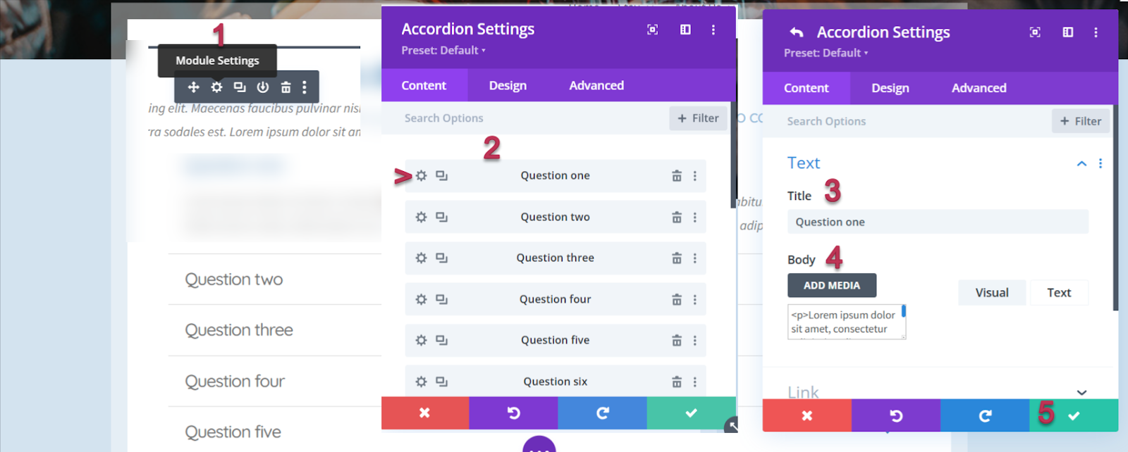 Accordion and Toggle modules have very similar settings, the only difference is that accordions can display only one contents at one time – perfect for your FAQs page. Simply click the settings icon to reveal the questions list and you can add your answers in each text editor.