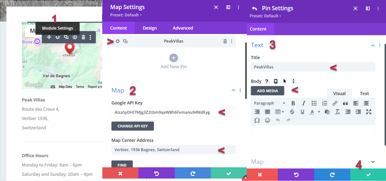 Scroll to the Map menu and enter your API key. In Map Centre Address, type the city or town to be used as the map’s centre point, then click Find. Use the + and – icons in the preview to zoom in or out, or drag the map with your mouse for precise positioning.