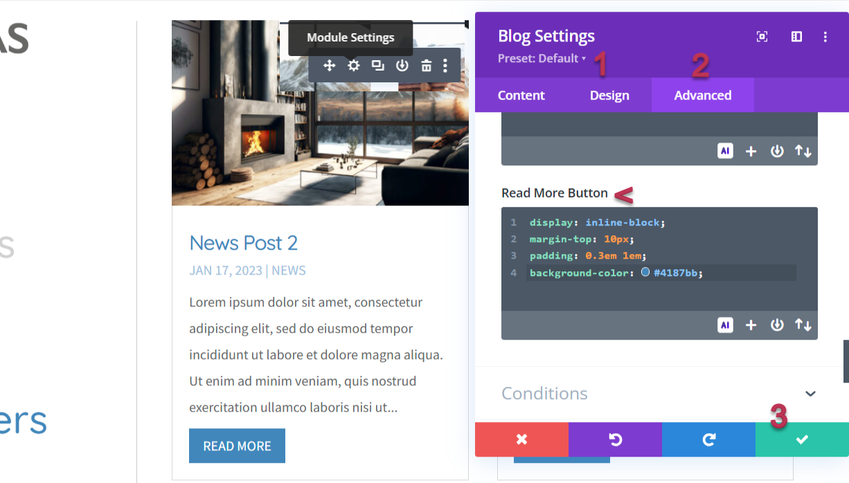 2. In the module settings, visit Advanced tab > Custom CSS > Module Element > scroll Down and find Read More Button where you will see the default styles added. The code you may need to add/edit is the hex value of: