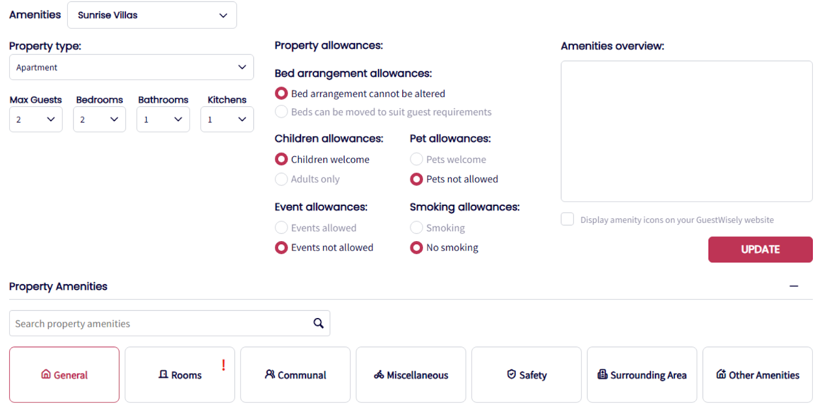 Amenities: All amenity categories show in GuestWisely (leave room-specific amenities blank to display the full list).