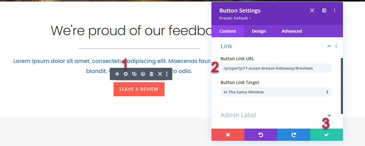 Enter the Reviews page via the page builder, and select the button settings. Under Link Menu you will see the default URL which includes the anchor ID of ‘#reviews’. Replace the URL with your own, leaving the ID at the end.