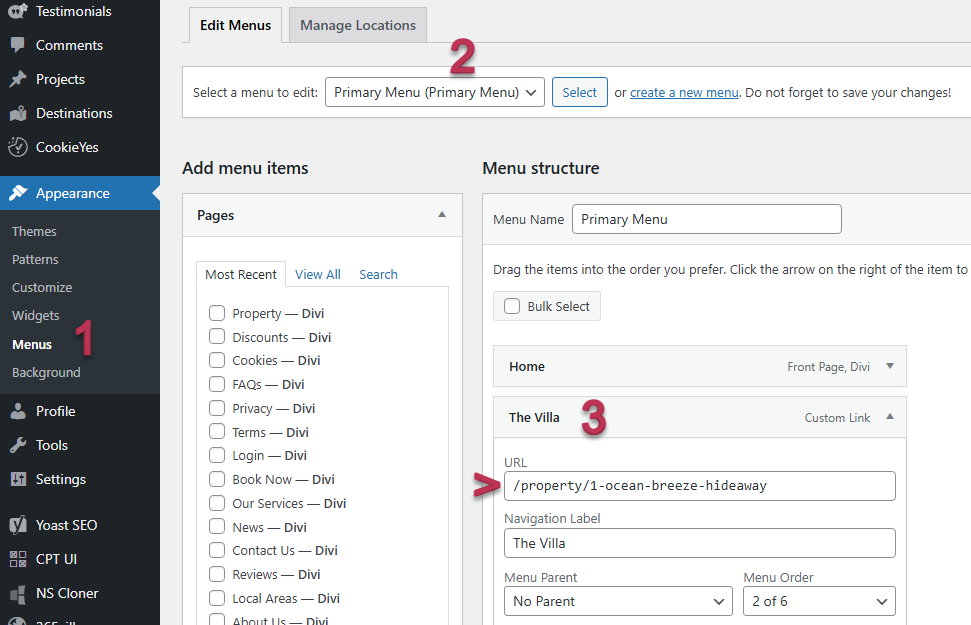 You can now visit your menu settings, select your required menu and replace the default URL for menu item ‘The Villa’. Save Menu and repeat for footer if needed.