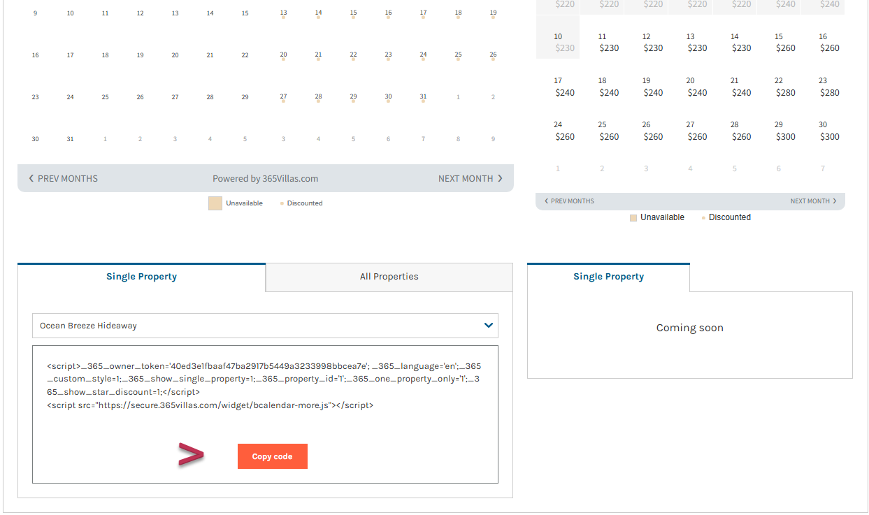 The difference here with the availability calendar, in comparison with the one used on the property page, is that the page is not set as a template that pulls data through our API via shortcodes. So instead, a script must be generated from the booking engine page in your Guestwisely account. After you have customized your booking engine colours, select the Camelot Suite (which is used for Sierra Theme) and scroll down to the bottom of the page and copy the script for your single property.