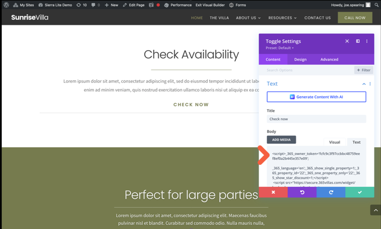 Next visit your homepage and enter the Divi visual builder. The calendar has been placed inside a Toggle Module which opens on request. Enter the settings and you will see the default script that needs to be replaced with your own.