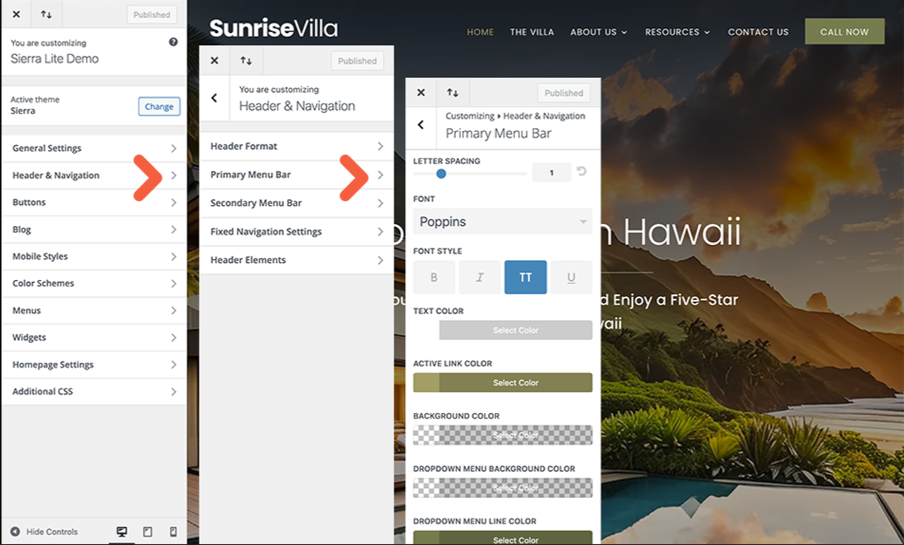 Visit the Theme Customizer to make edits to your Header Background Colour and Menu Fonts. The Menu Call Button is still controlled via custom CSS as explained in Sierra Tutorial.