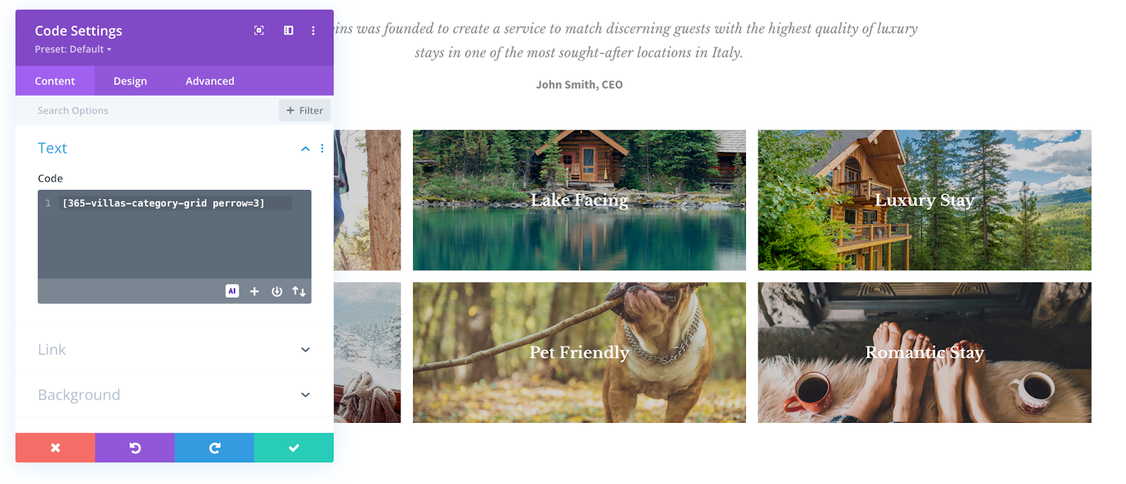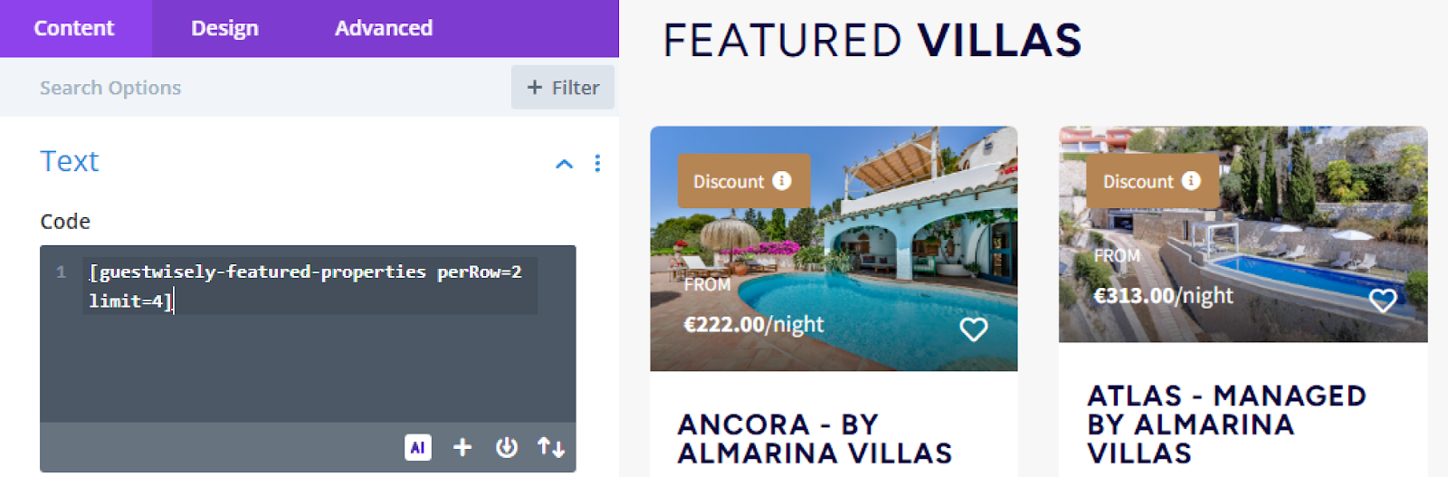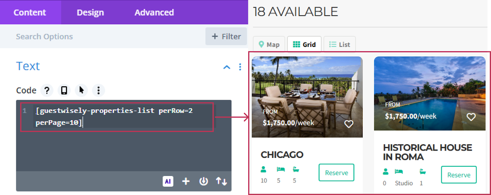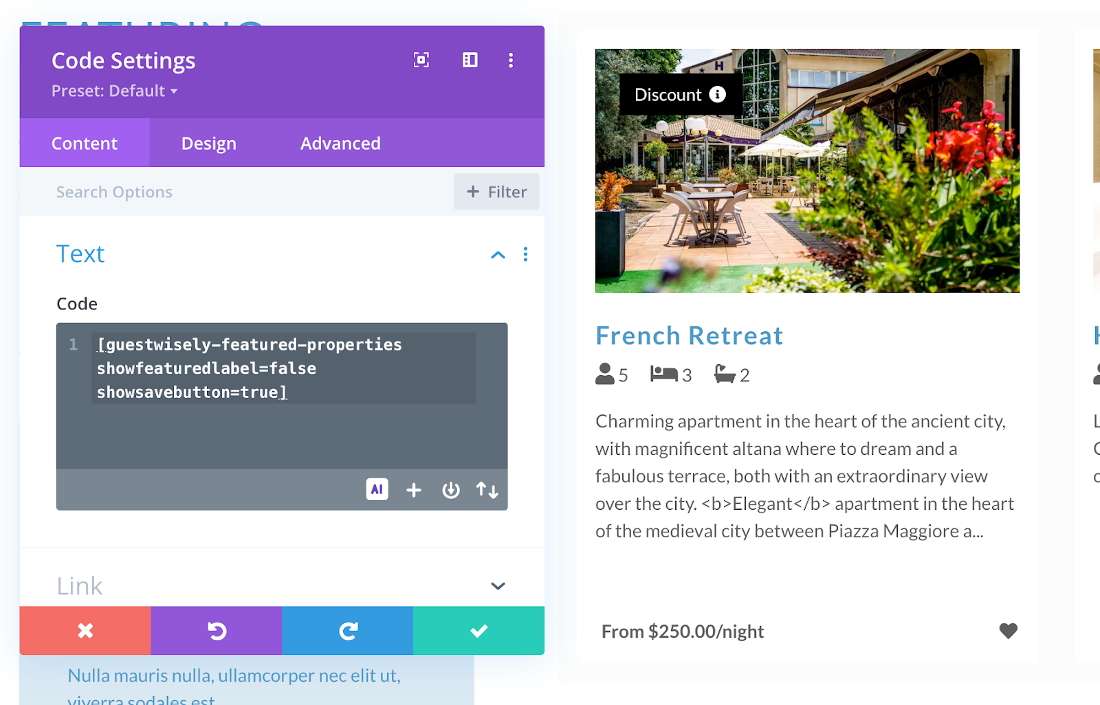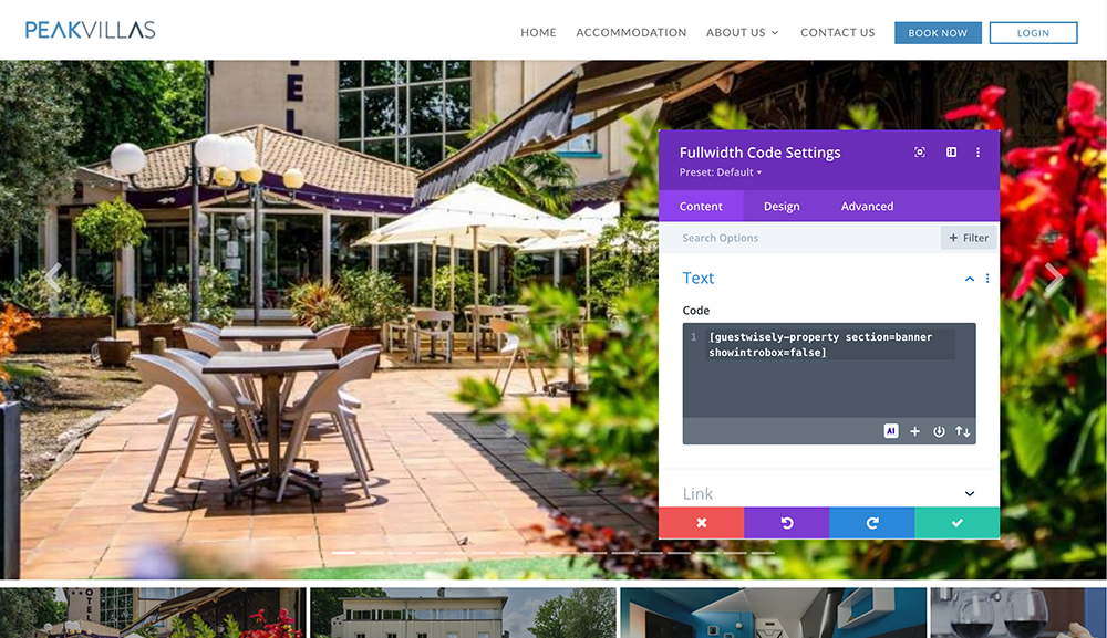 Short codes let you display specific content from your GuestWisely account, such as property details, availability, or booking forms. After your pages are designed using Divi or another page builder), simply insert the required short codes.