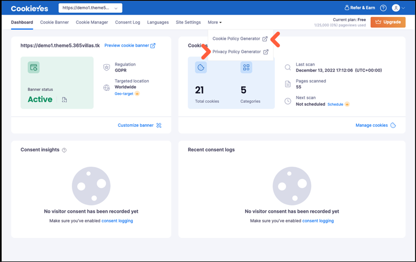 Once an account has been created it will take you to the CookieYes app. Under the More menu you will see the separate policy generators. Go through the steps for each one, entering your information and answering the questions.