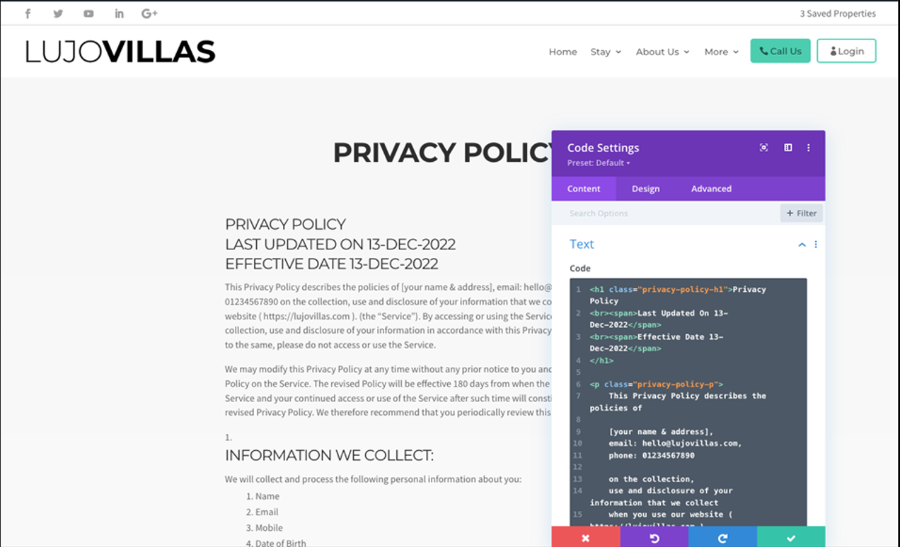 Open your Privacy or Cookie Policy page and edit the code module and in the Code field, delete the default text and paste in your copied HTML from CookieYes and the module will render the text on the page.