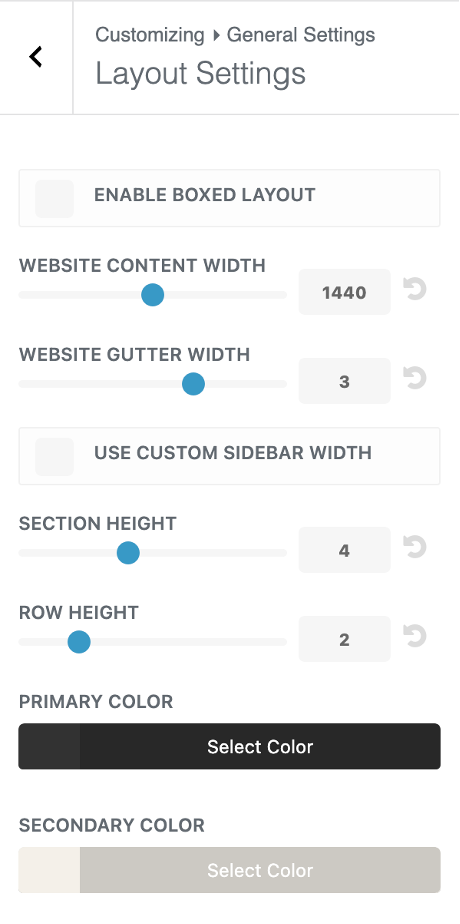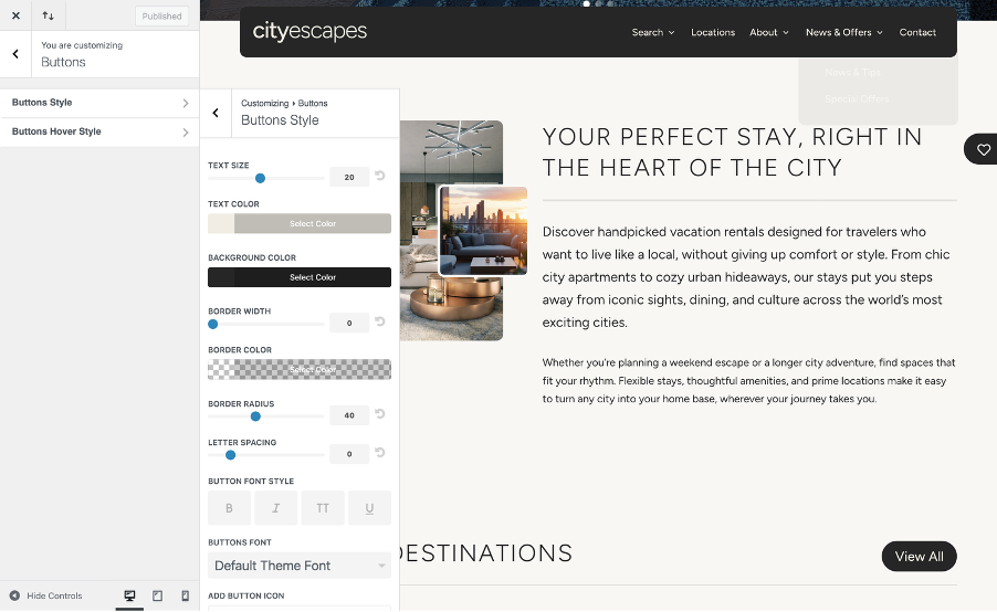 Click back to the start of the Customizer menu and visit Buttons > Button Style. Control a range of design options for your default button including background color, borders, corner edges and font family and size. These styles can be overwritten later in the visual builder if you want to use alterative styled buttons too.