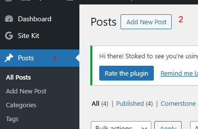 Before you start entering posts, you may consider creating further categories than the default 3 that have been set up. Simply add a new category name and then the Add button – the slug (which forms part of the URL is generated automatically from your entered name.