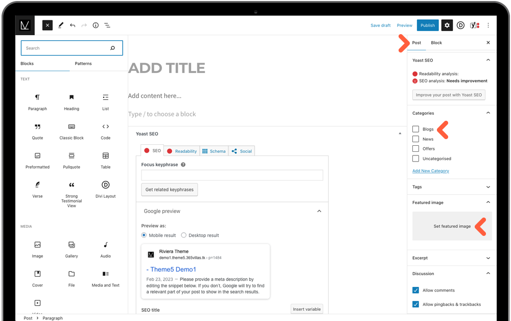 When you are happy with the content of the post, you then need to select Post from the top right tabs – this will allow you to scroll down and assign the category via checkbox (multiple can be selected) and select the Featured Image, which is the main image that displays in the list view AND inside the page header of the individual post page. For that reason, the featured image should be no less than 1200px wide to avoid low resolution display.