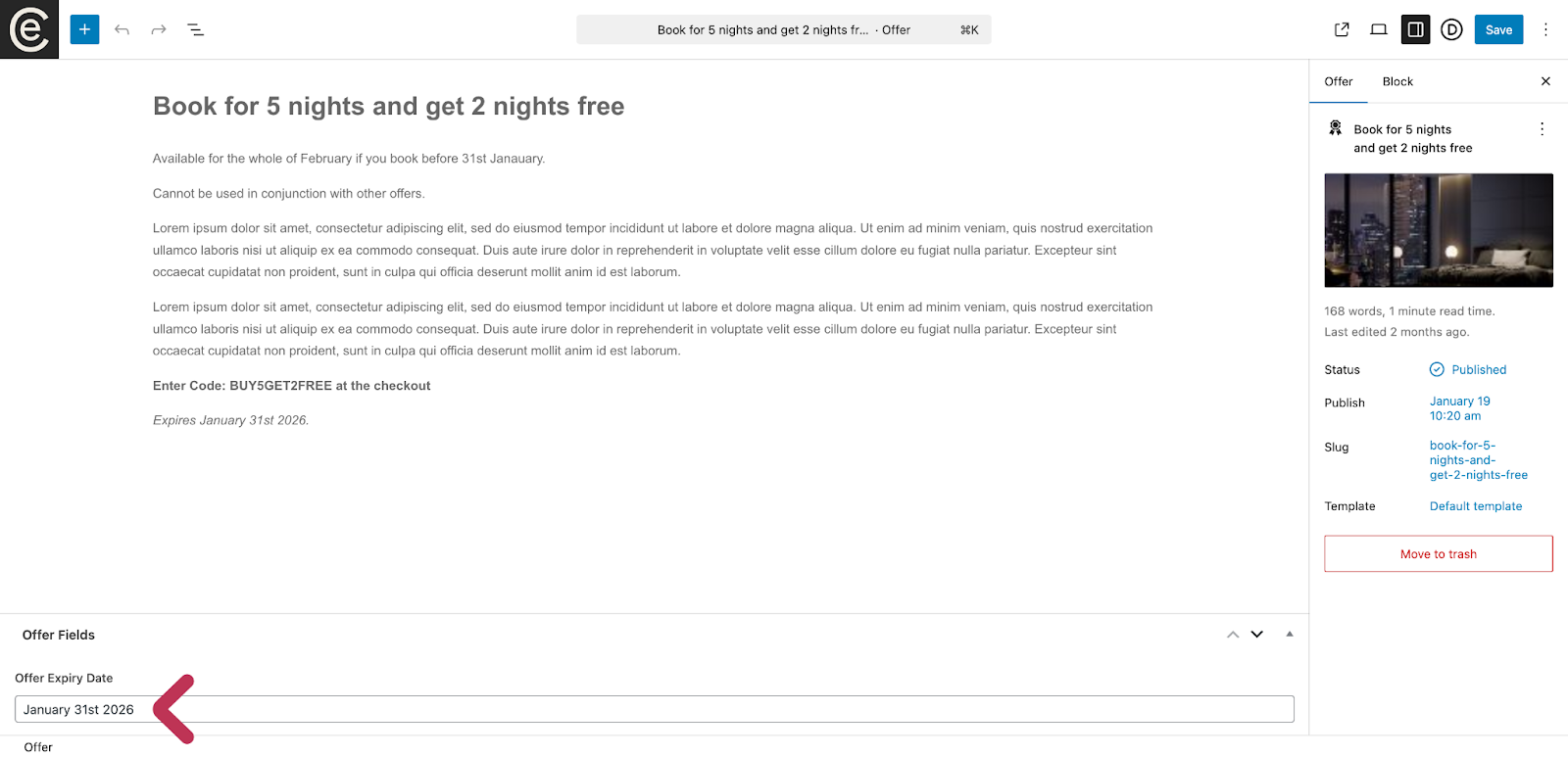 The process is the same as News, without the need to assign a category. The only extra setting here is remembering to add an offer expiry date which will display on the grid item on the offer page.