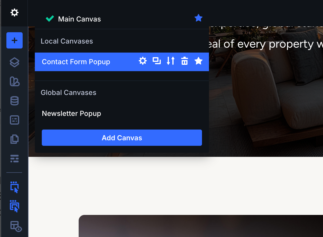 This will open the off-page canvas and you can make edits to the popup container if required. You will notice the screen is appearing faded and this is because the modal is hidden by default and requires a button click interaction to make it appear on the front-end.