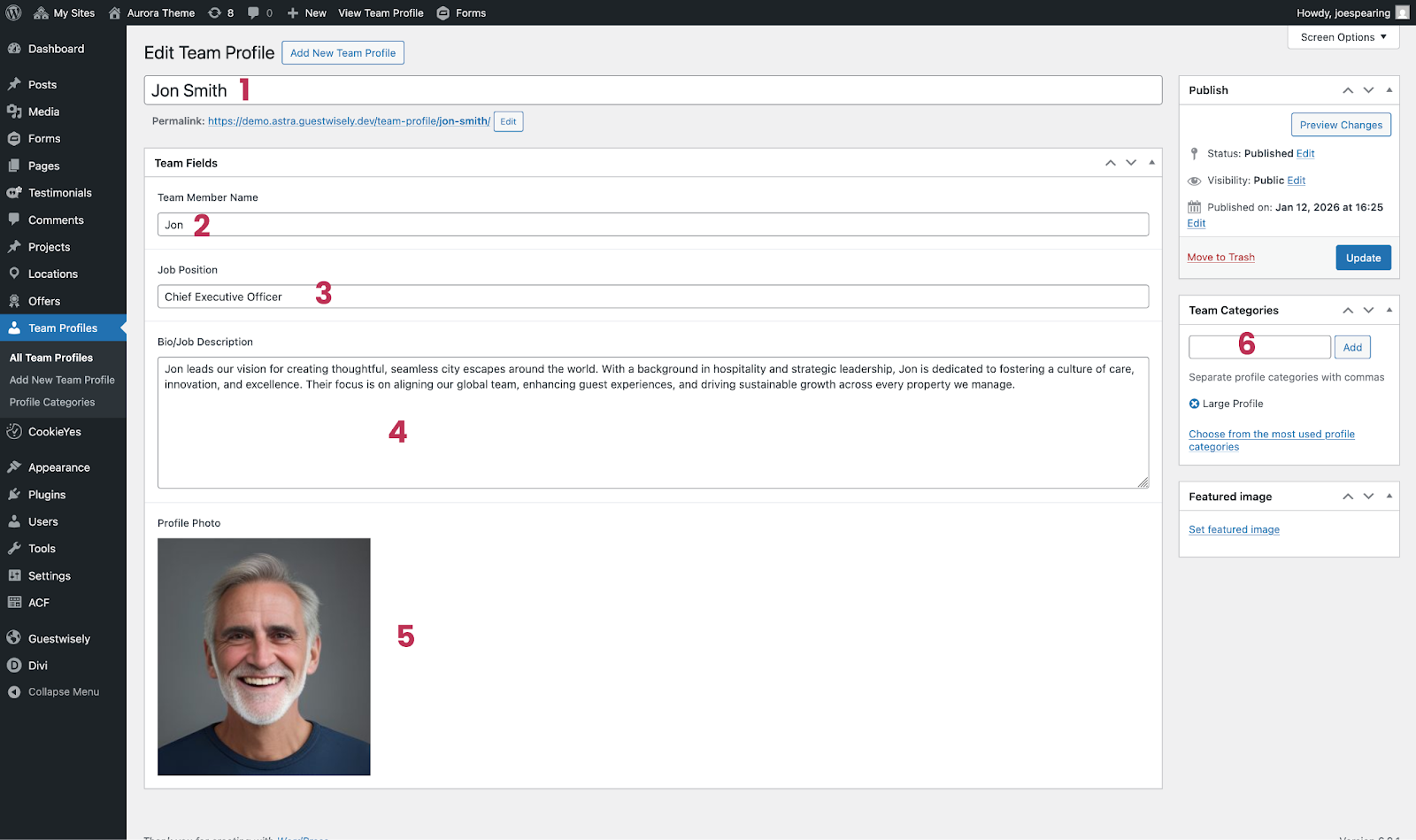 Team Profiles are also controlled via custom post type fields in the WordPress CMS. Before we visit the settings, notice on the front-end that there are two tiers of profiles with the first larger set including a written bio.