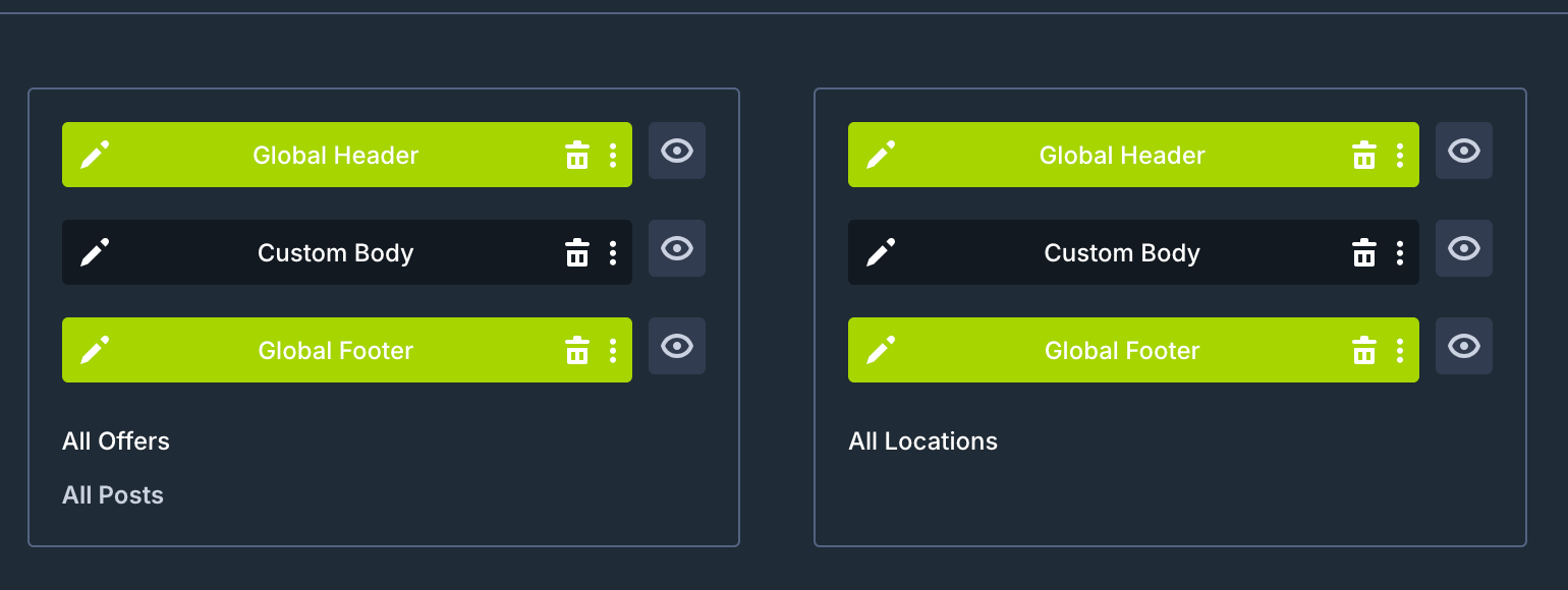 The above header and footers will apply to all pages on the site but you will notice in the Theme Builder that there are other templates with a Custom Body. These are templates that are used for more than one page type or post eg. your blogs, offers and location pages.