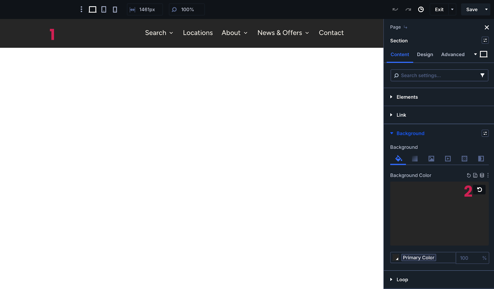 If you require to change the header background color, you will need to update both the section background color plus the menu module background color that sticks to the top of the browser on scroll. Select the blue section and the grey module then head to Content > Background > Background Color - use the arrow icon(2) that appears on hover to reset the global variable and then add your own hex value.