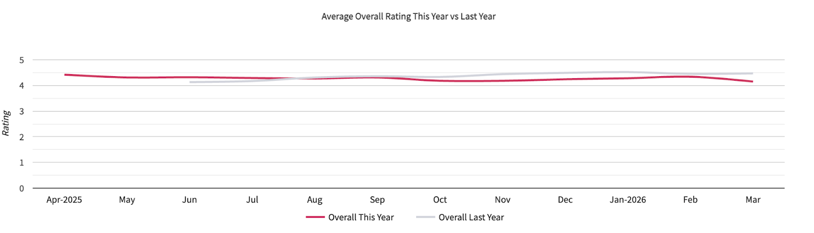 You will also find a comparison of overall ratings between the current year and the previous year. These ratings are displayed as color-coded graphs, making it simple to visualize improvements or declines over time. For example, last year’s ratings may be shown in gray while the current year’s data is highlighted in magenta, giving you a quick, visual comparison at a glance.