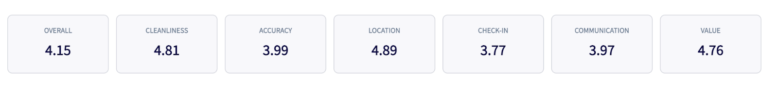 A major advantage of the Quality Dashboard is its detailed category breakdown, where Airbnb organizes guest feedback into specific categories, each rated on a scale of up to 5, such as: