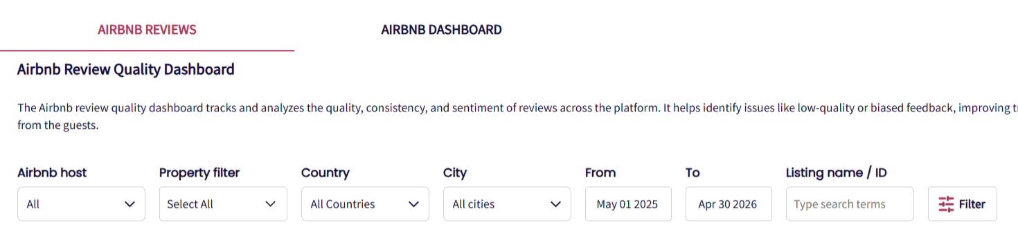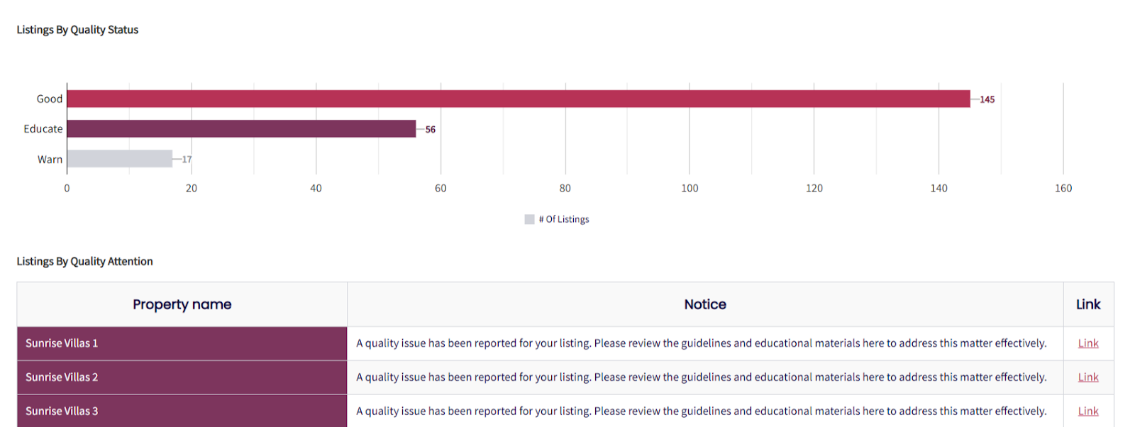 Together, the Reviews and Listings Quality Dashboards give you full visibility into guest feedback and property performance, empowering you to make data-driven decisions that enhance both quality and bookings.