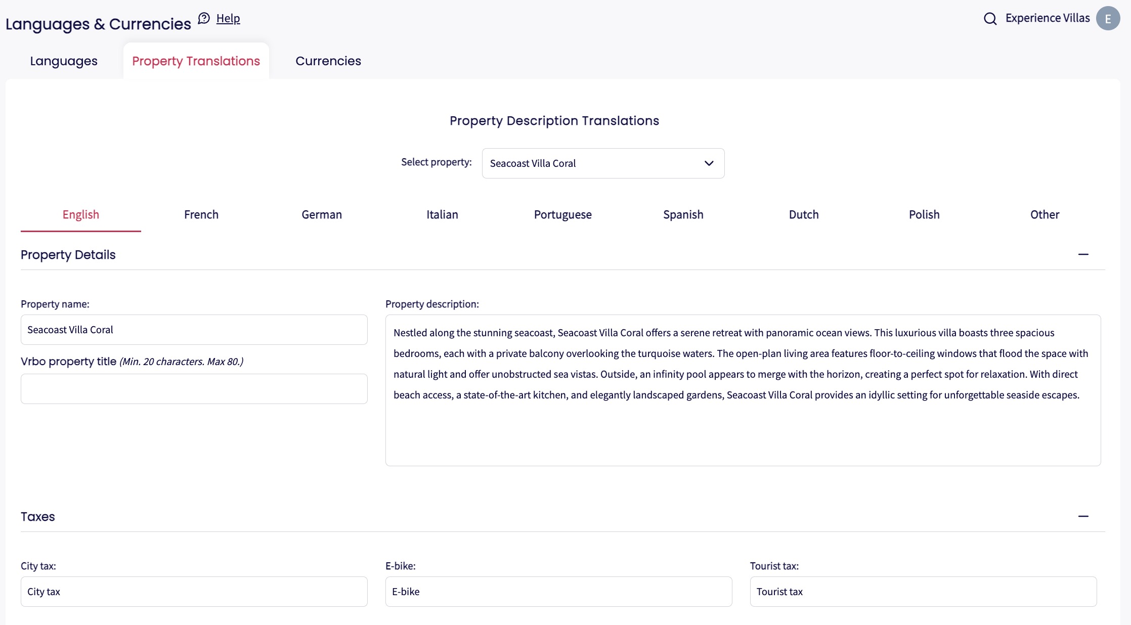 Nombre de la Propiedad, Descripción, Servicios, Instrucciones para Huéspedes y Nombres de Impuestos