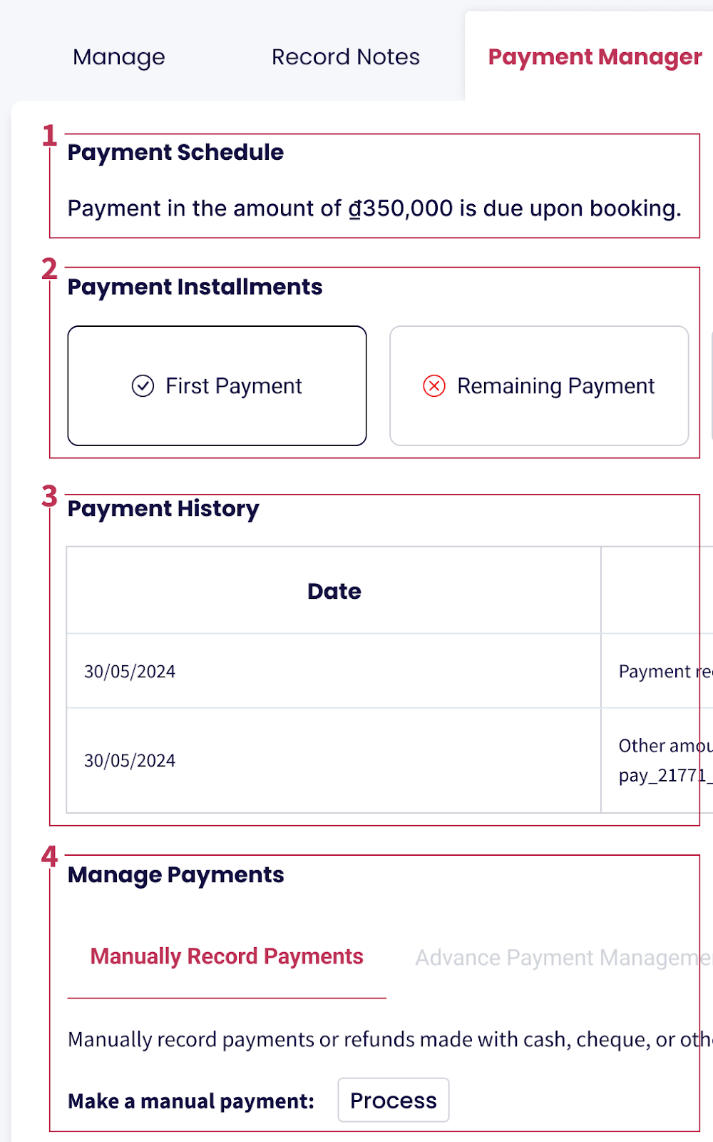Cobros automáticos a la tarjeta del huésped según el Calendario de Pagos después del primer pago, con opciones para Process o Cancel transacciones programadas.