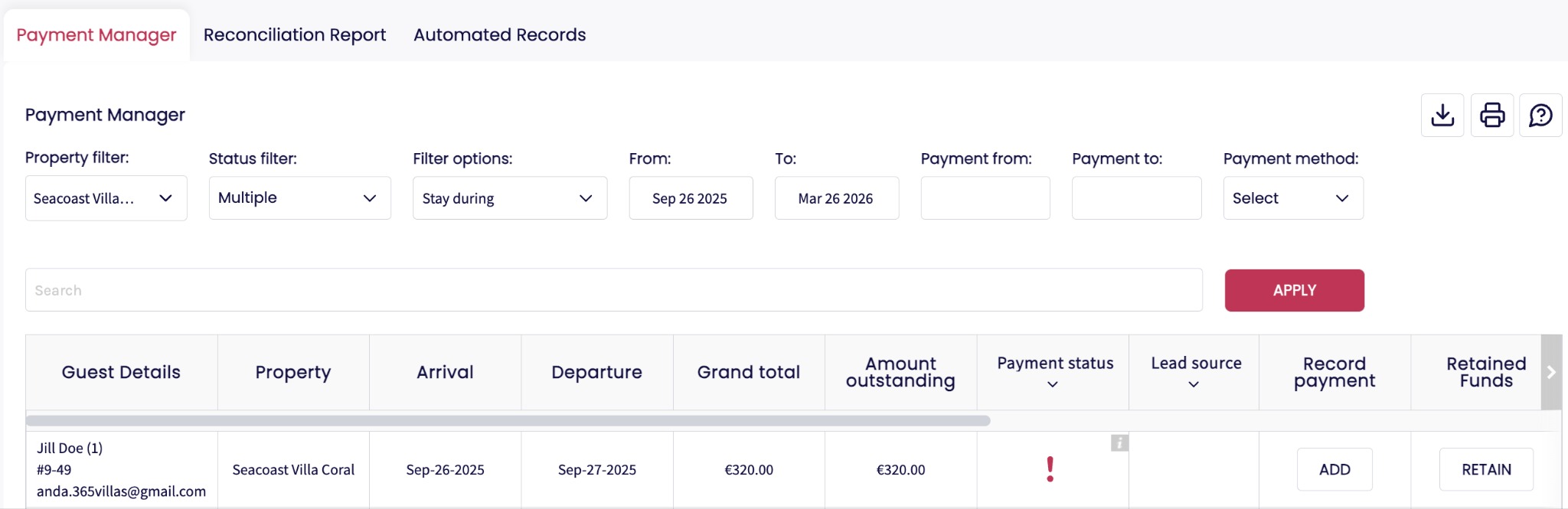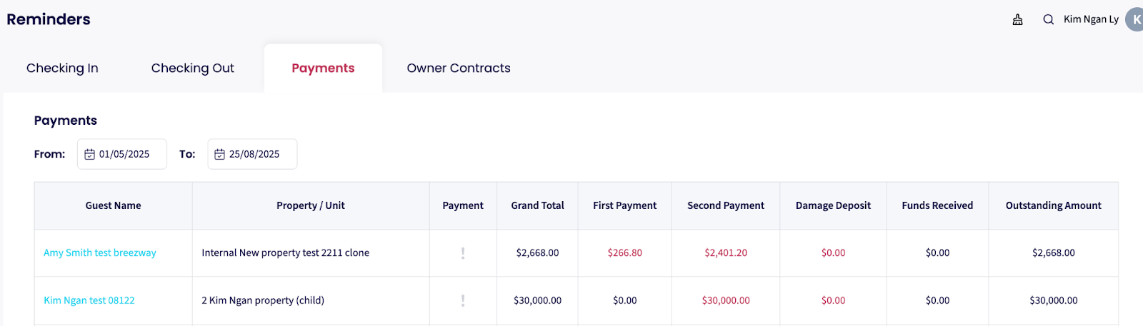 Informe de Gestión de Pagos: visión integral de todas las propiedades, incluidos pagos fraccionados, pagos recibidos, depósitos por daños, fondos retenidos y saldos pendientes.